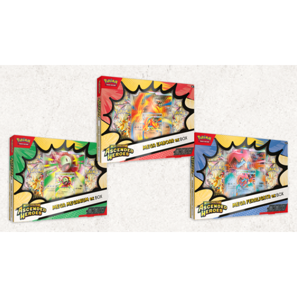 ¡Forja un vínculo que lleve la fuerza de tu compañero Pokémon más allá de sus límites con la Megaevolución! En esta colección, encontrarás una carta holográfica de promoción de Mega-Meganium ex, de Mega-Emboar ex o de Mega-Feraligatr ex lista para jugar y también una carta de gran tamaño con efecto 3D y dinámicas ilustraciones, además de cuatro sobres de mejora de la expansión Megaevolución-Héroes Ascendentes.
