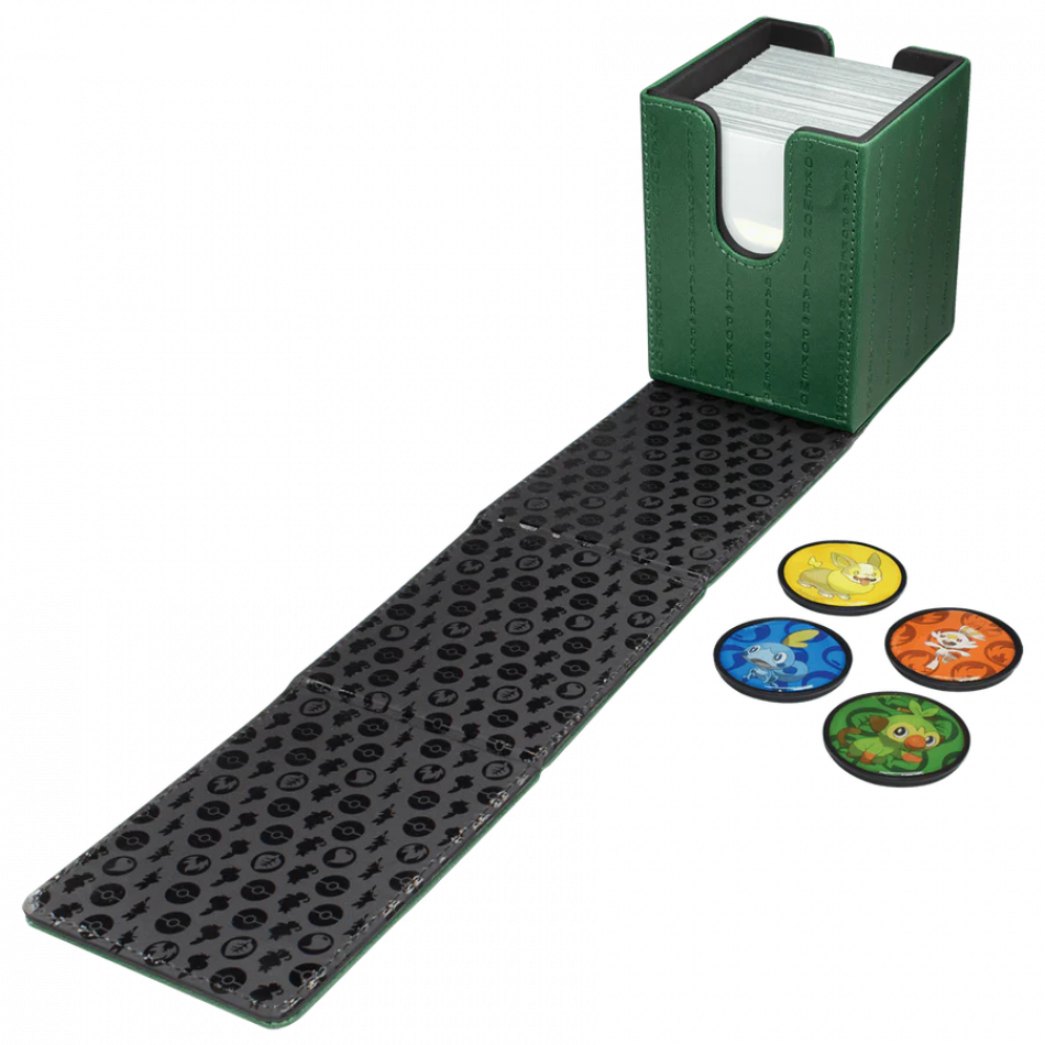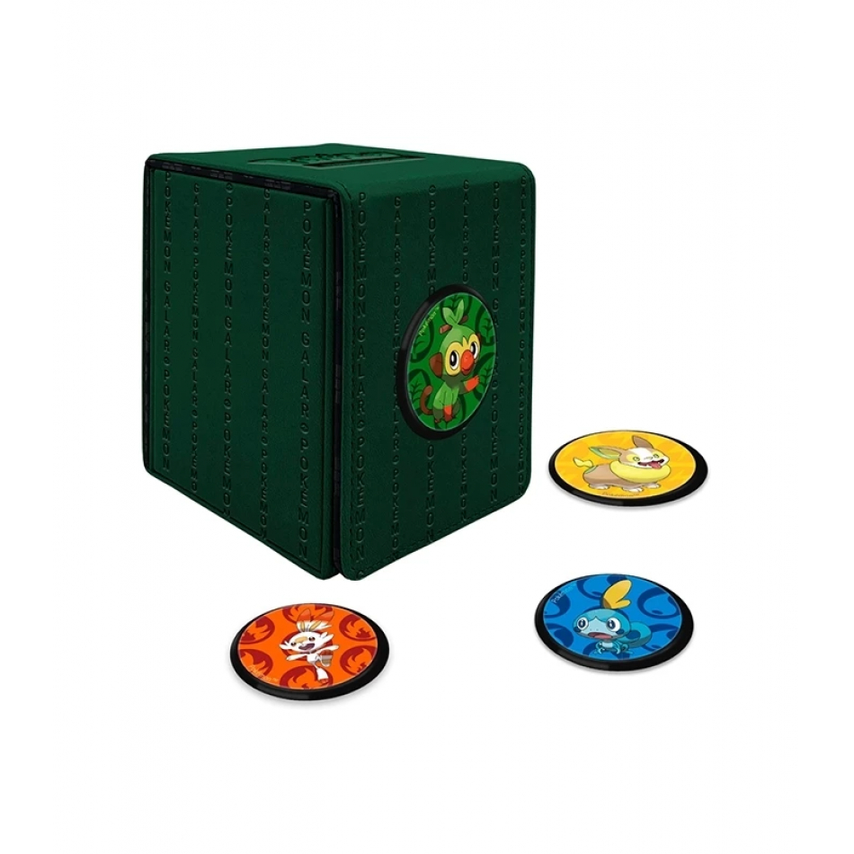 ¡Colecciona, guarda y personaliza con la Alcove Click para Pokémon! La Alcove Click viene con cuatro insignias temáticas con Scorbunny, Grookey, Sobble y Yamper. Esta Caja de Baraja tiene capacidad para 100 cartas coleccionables de tamaño estándar con doble funda Ultra PRO Deck Protector®, cuenta con un fuerte cierre magnético y tiene dos ranuras para el pulgar para facilitar el acceso a tu baraja. Personaliza tu Alcove Click colocando tus chapas magnéticas favoritas y sustituyéndolas por otras chapas. Las chapas tienen un diámetro de 1,5 pulgadas. Es el accesorio perfecto para cualquier jugador o coleccionista de Pokémon TCG.